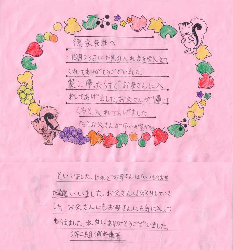 Tea Class conducted at Ureshino Elementary. A cheerful message from the students. |